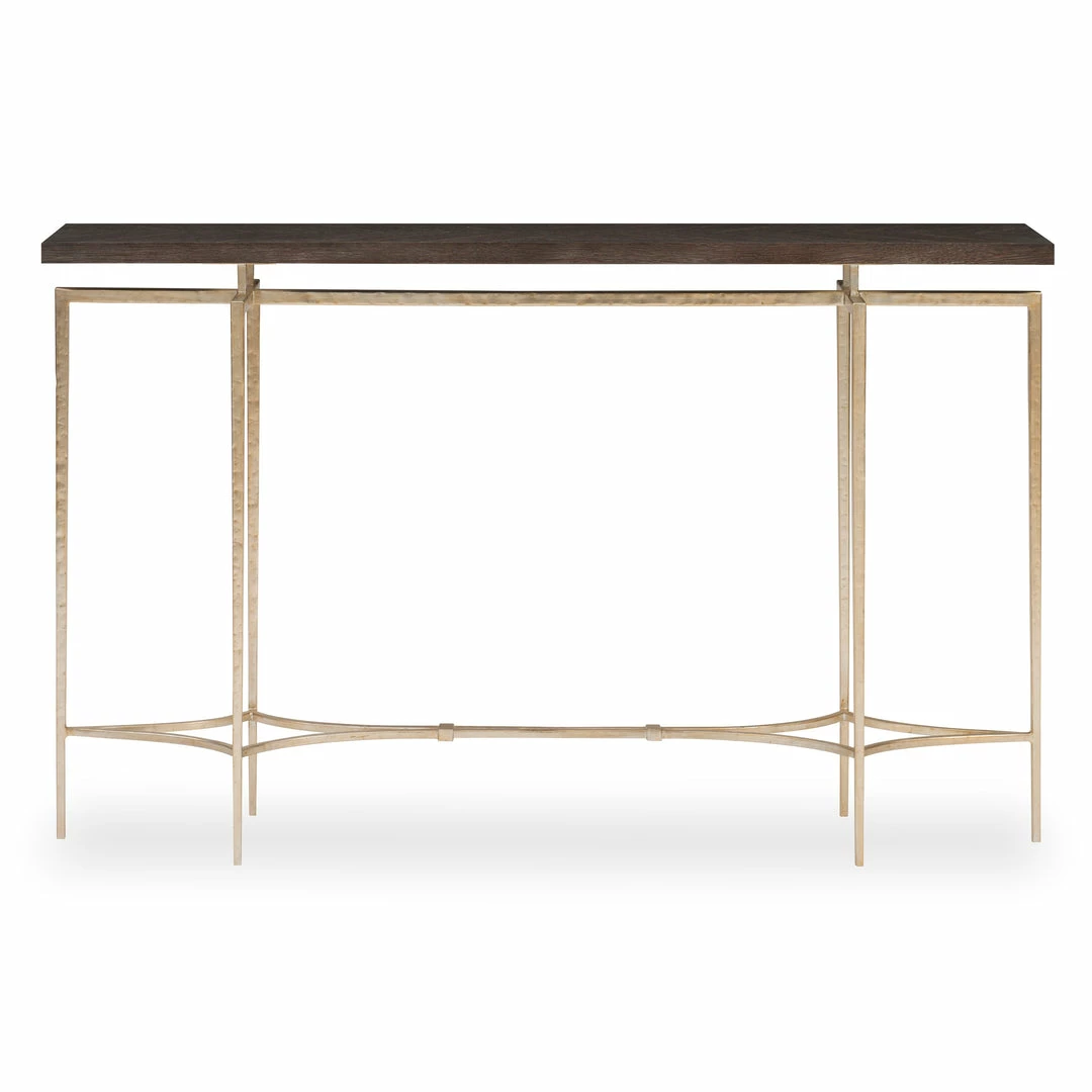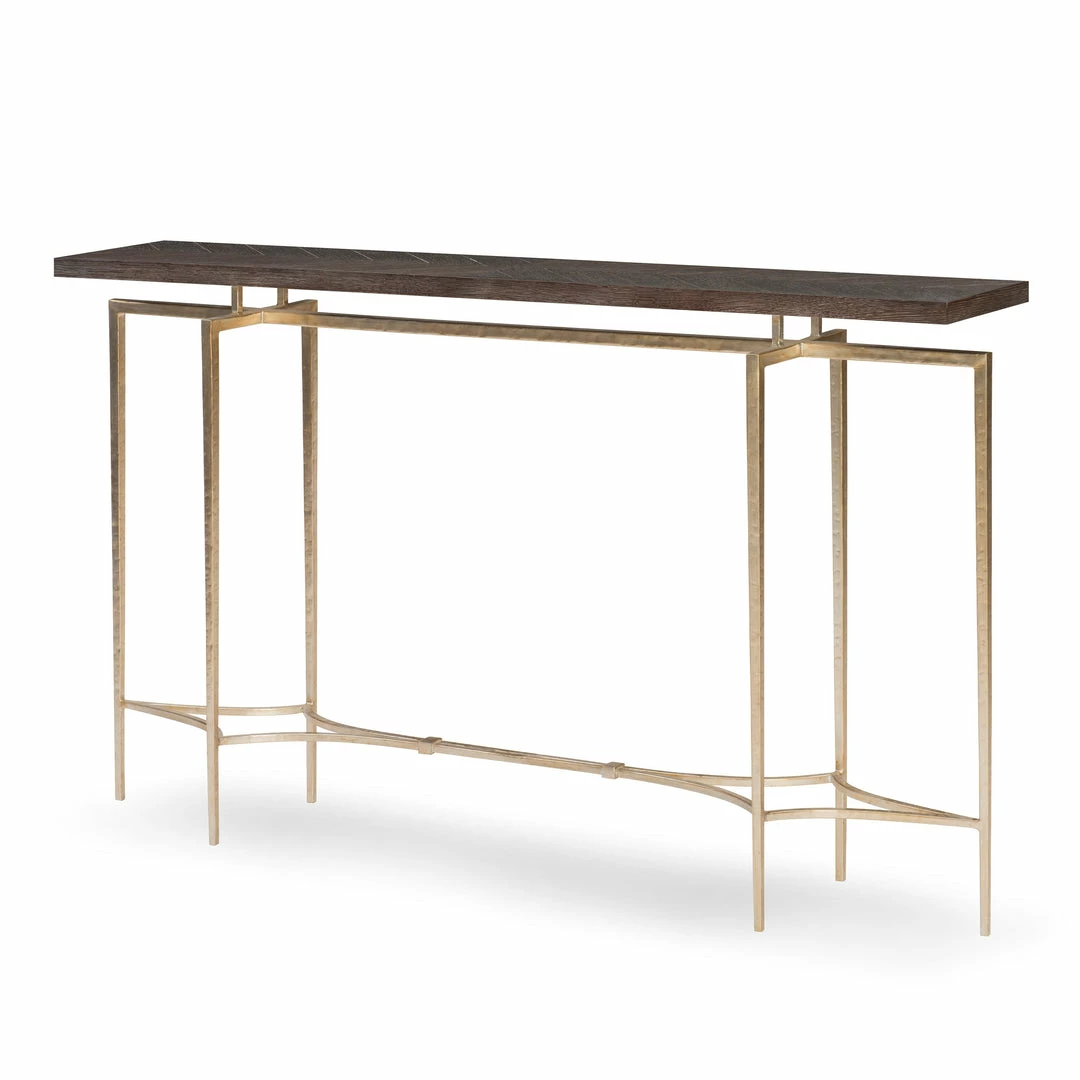 This elegant console features a herringbone Oak veneer top raised over six slender legs tied together with diamond shaped stretchers. The legs and stretchers are finished with a hammered texture in a glossy silver finish.