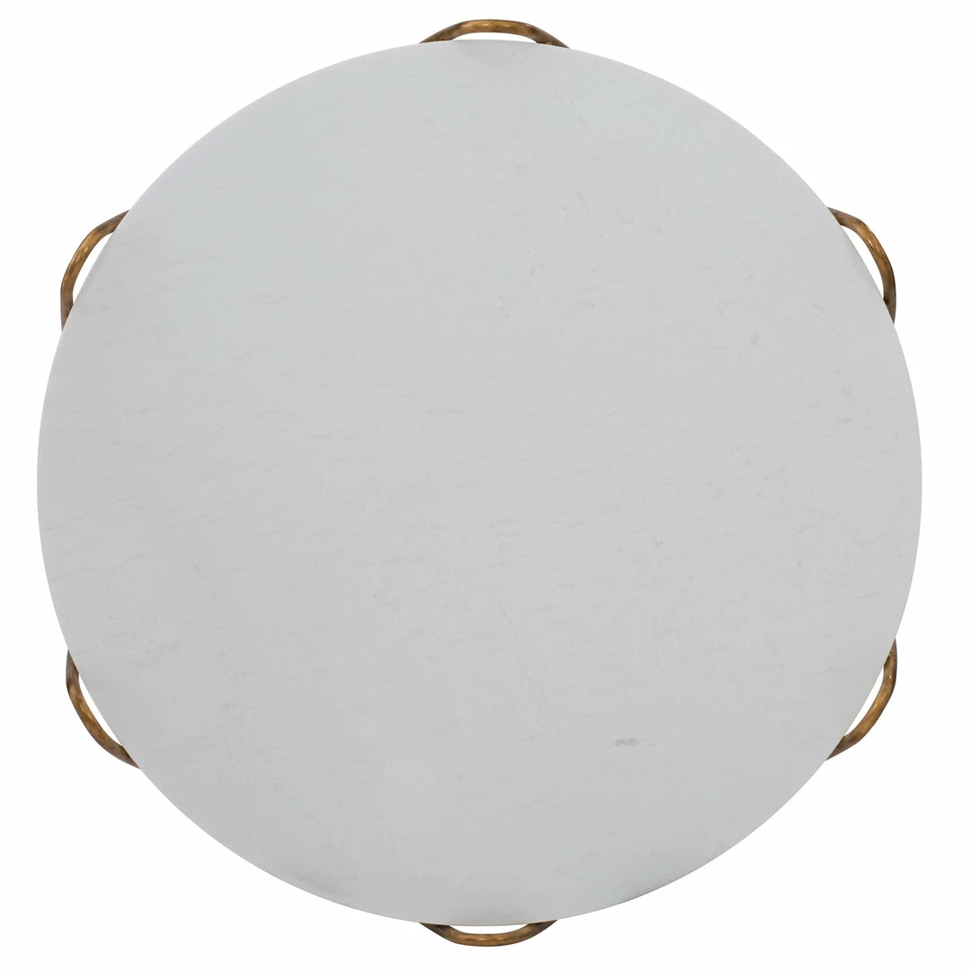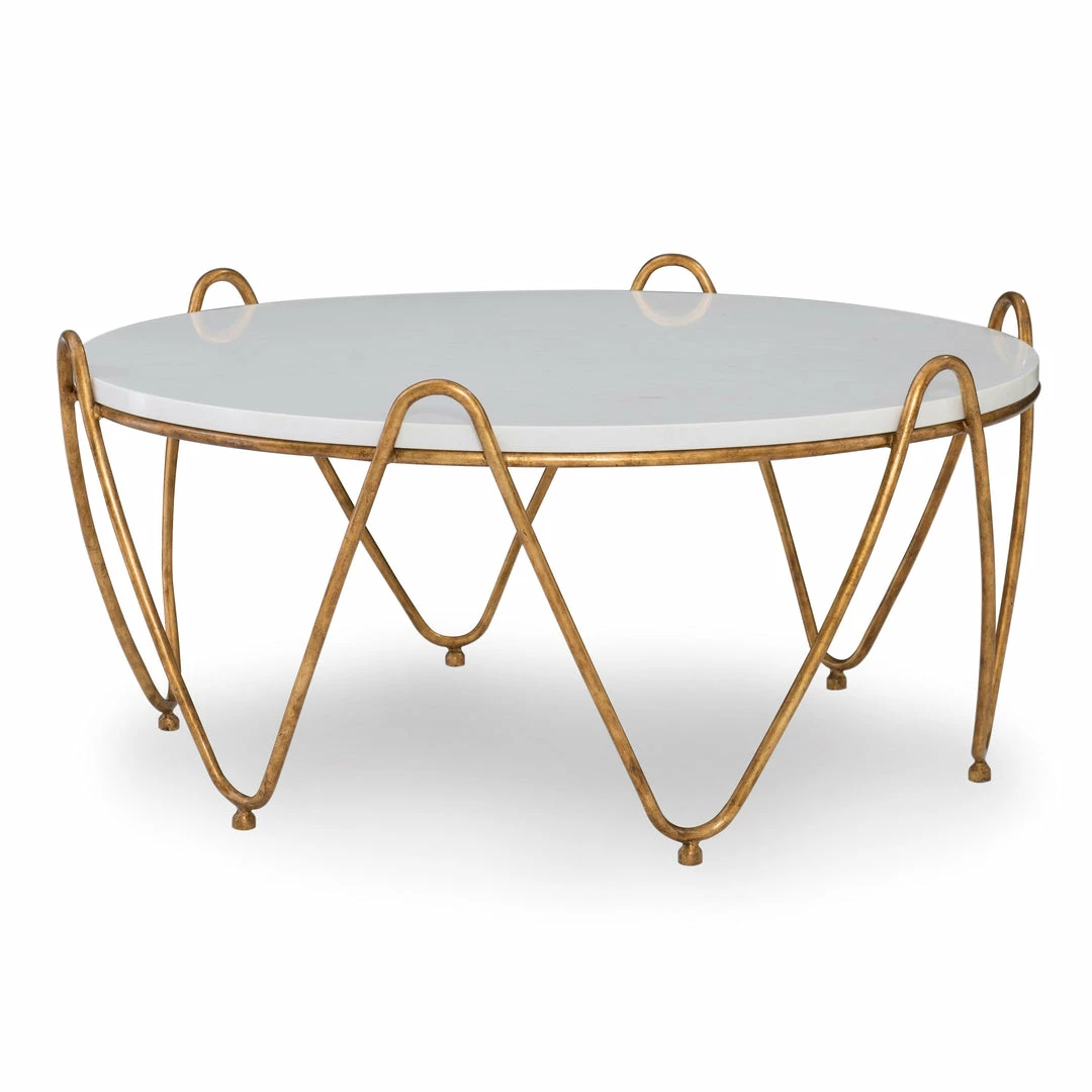 This Regency Moderne inspired cocktail table features a twisting, undulating gold metal base raised on metal ball feet. A white round marble top completes this piece.