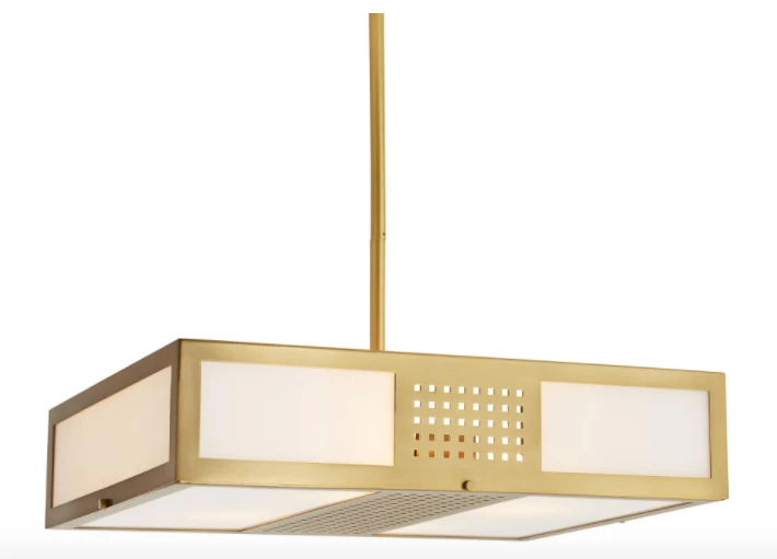 Clean lines, crafted from stainless steel, frame plates of frosted glass, so the light beneath is filtered beautifully. The mid-strip is hand-punched and casts scattered light in every direction. The bottom plates are removable for easy bulb replacement. The brass tones are a brushed, antique finish that runs all the way up to the flush mount. Fits four standard bulbs. Also available as a rectangular pendant (DC49002) and sconce (DC49003). Approved for use in covered outdoor areas.