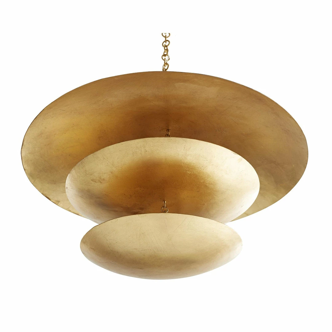 The Florko Chandelier is out of this world. This eight-light design features gold-leafed iron curved discs that float effortlessly under the space-like dome. Both lower levels hold lights, creating a soft glow. The hand-applied gold leaf finish may vary. Additional chain available (CHN-123). Also available in a silver-leaf finish 82000.