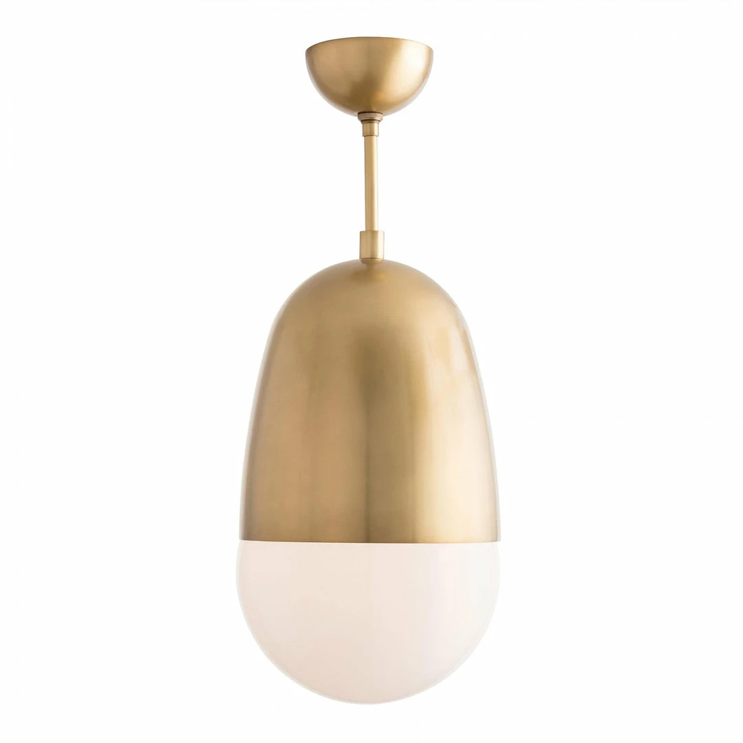 An opal glass shade fits perfectly into the antique brass base in one continuous, oval, bulb-inspired Germaine Pendant. Glass and familiar curves create a warm, familiar design. Also available in brown nickel and smoke glass (49053). Approved for use in covered outdoor areas. Additonal pipe available (PIPE-101).