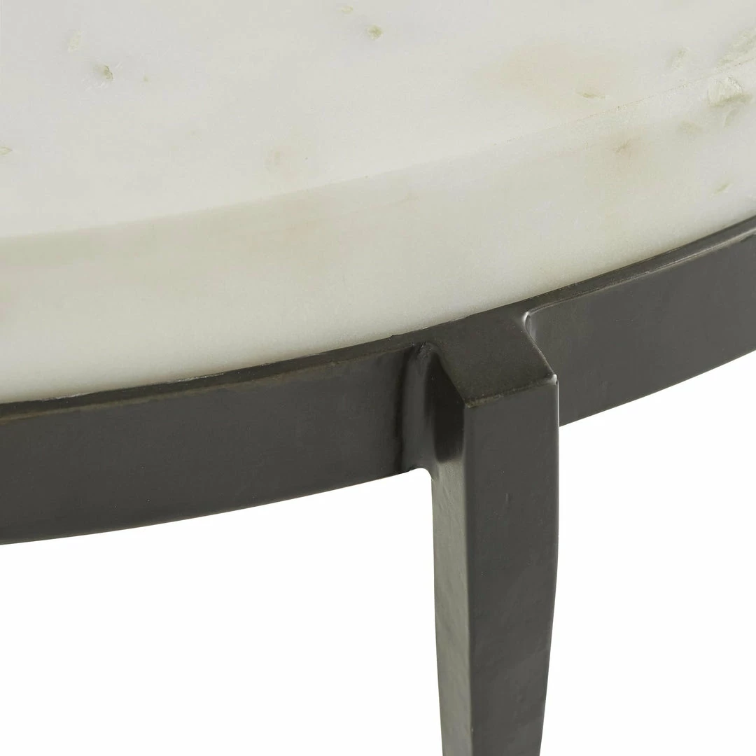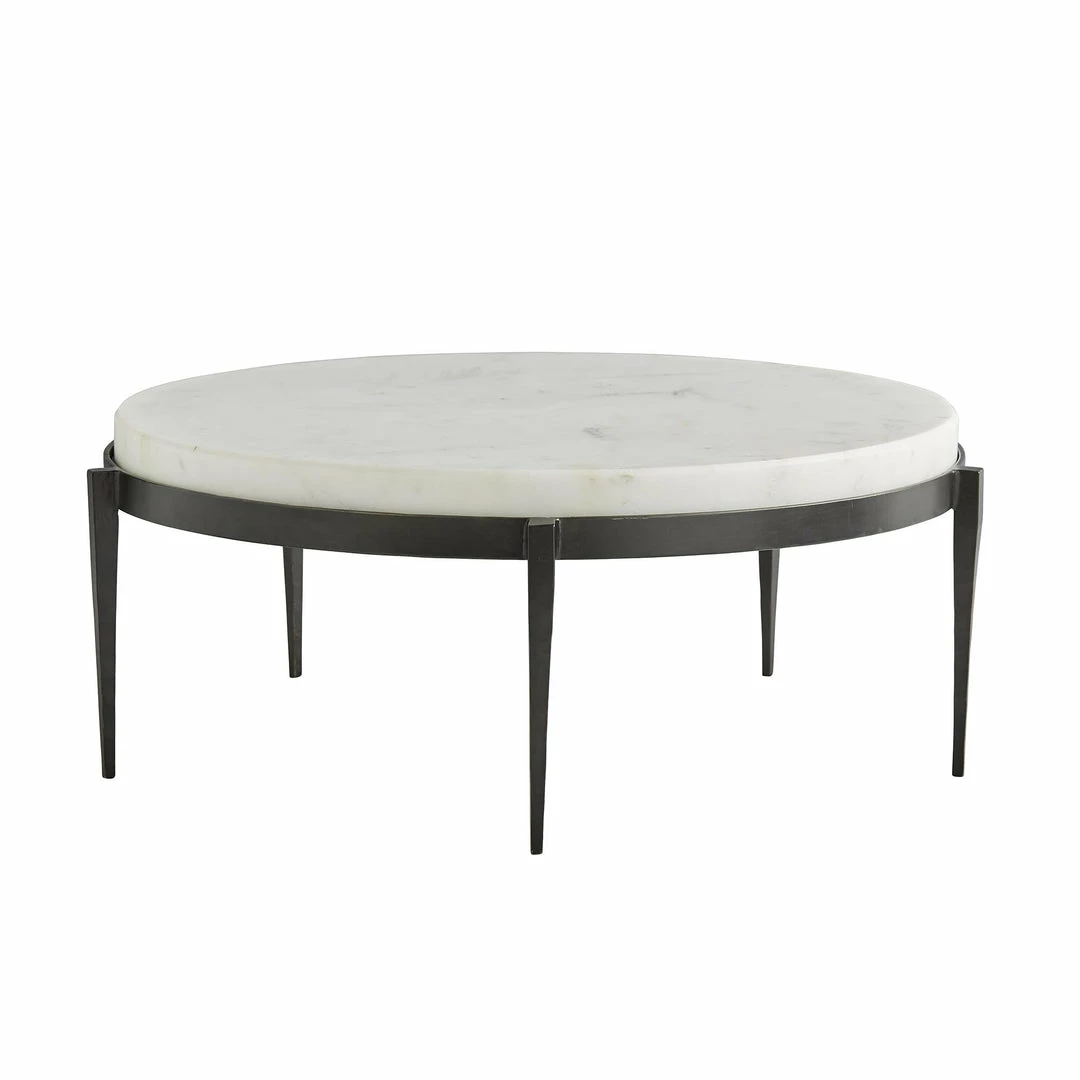 We love the yin and yang on this transitional cocktail table. Hand-forged black iron legs are delicately tapered creating the perfect base for the chunky white marble top. Also available as a side table (4391). Marble may vary.