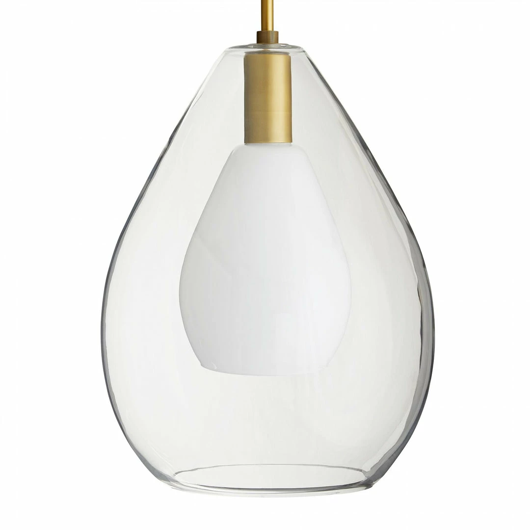 Two shades of hand-blown glass forms the drop of this pendant. Seemingly simple in its design, an inner teardrop-shaped shade conceals a standard bulb in opal glass, then a larger shade rests outside it, exposing the inner piece in clear glass. Both hang from a stainless steel stem and mount, both finished in antique brass. Additional pipe available (PIPE-180). Also available in brushed nickel (49174). Approved for use in covered outdoor areas.