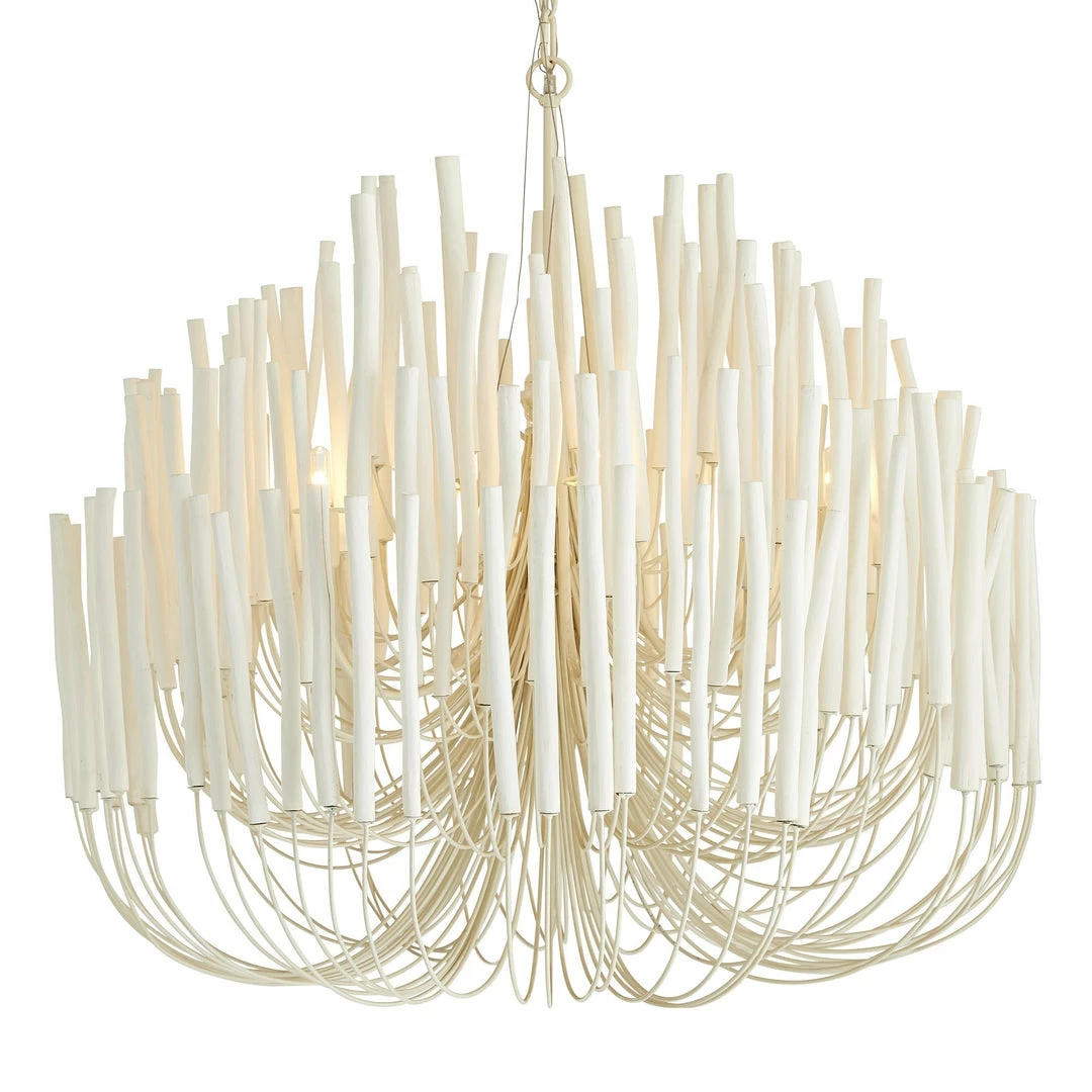 6-light chandelier with several tiers of wooden sticks on curved iron arms, all in a whitewash finish. The wooden dowels are placed atop pliable arms. When switched on, the light glows from within and transforms the space into something magical. During installation, please ensure that all bulbs are not touching any of the wooden dowels. If they are, gently press the arm away from the bulb about an inch to allow heat to properly disperse. Also comes in small (89559) and as a pendant (49558).