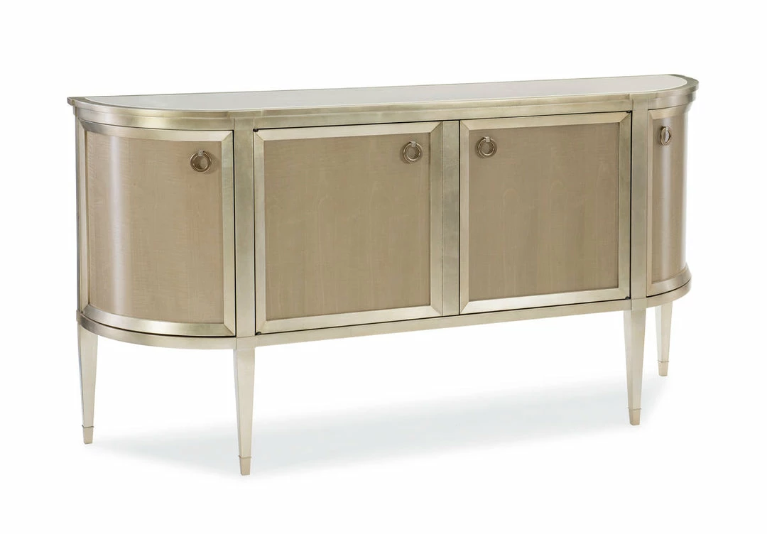 A classic reinvented, this glamourous half-moon-shaped, four-door credenza makes organization effortless. Its classically updated aesthetic is achieved with Fumed Figured Tiger Maple finished in Smoke and accented with Taupe Silver Leaf. A cream stone inset top encourages buffet serving. Adjustable shelves can be found inside, as well as a drawer with silver tray and two additional drawers. Drawer bottoms silkscreened with a trellis pattern add to the elegant appeal of its stylish interior.