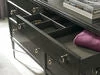 Six drawers with undermount soft-close guides. Two hidden drawers in bottom front rail with side guides. Metal stretcher in Whisper of Gold. Tempered glass top painted Seal Skin. Drawer interiors in Seal Skin. Herringbone vinyl pad in bottom of top drawer and hidden drawer. Top left drawer has drop down front construction.