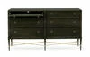 Masterpiece is a dresser with hidden secrets. Its linear frame in Charcoal Anegre is a modern interpretation on classic Hepplewhite designs. Its clean façade shows off the Whisper of Gold custom round ribbed pulls and thin crisscrossed stretchers between the tall square-tapered legs. Six drawers, painted on the inside in Seal Skin, are generous in size. The top of the piece is embedded with dark glass. The top right drawer has dividers and a taupe/charcoal herringbone pad. The front of the left drawer drops down. At the bottom of the piece are two hidden drawers for papers and valuables. This is a signature dresser with dignified style.
