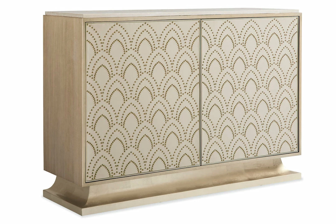 The distinctive beauty of the Art Deco movement is captured in the signature style of this fashionable cabinet. Decorative nails in a Champagne Gold finish create an artful stylized fan pattern across its two touch-latch doors. Place it in any room to add luxurious style and enjoy it as you would a piece of artwork. Topped with Moonlight Marble, it offers the perfect surface for display as well as serving beverages while entertaining. Its contemporized silhouette is crafted of elegant Koto veneers and finished in Winter Wheat. Inside you’ll find an adjustable shelf and drawer while a shimmering Golden Blonde Leaf finished highlights its shapely base.