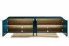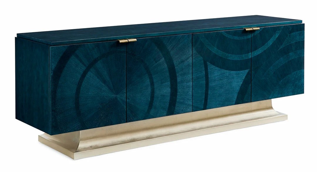 A stunning statement-maker, this impressive console is brilliant in blue. Its sleek silhouette is distinguished by an Art Deco-inspired pattern brought to life in a can’t-miss shade of Peacock blue over Koto veneers and Bird’s Eye maple inlays. A luxe Golden Blonde Leaf finish highlights its base while its four doors open with tab pulls to reveal generous storage space and adjustable shelving and wire management.