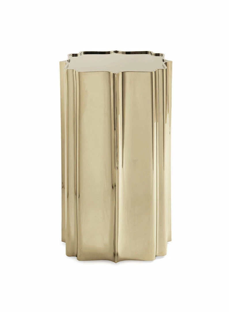 Shiny Whisper of Gold metal has been crafted into a lyrically scalloped, columnar side table. The slight raised edge around the top keeps drinks in place. This piece is perfect for reflecting the party around you.