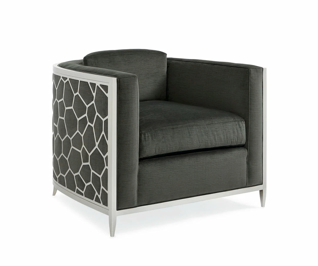 Here’s a chair that’s sure to become a topic of conversation. Its custom-designed pierced-metal frame offers a modern honeycomb design and is finished in Lightly Brushed Chrome. A rich charcoal strie velvet adds elegant styling and sumptuous comfort. Its geometric simplicity and plush textural appeal will add visual interest to any space.