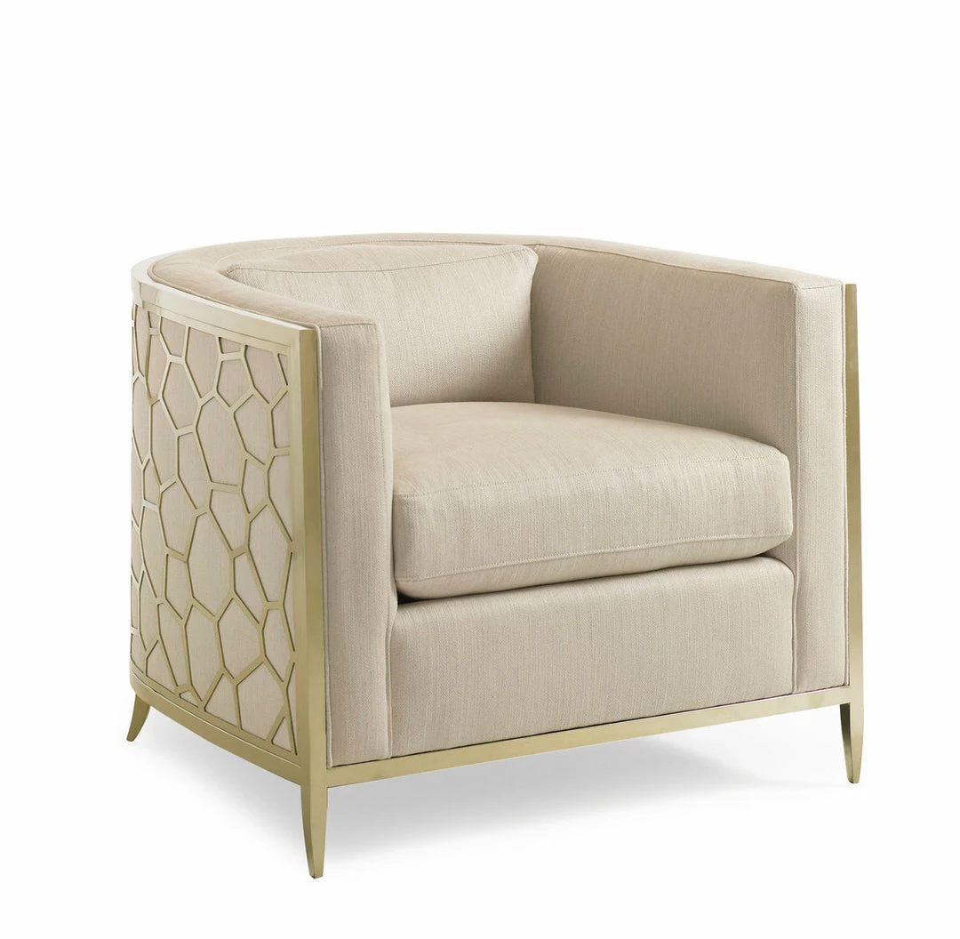 Get the party started with a chair they’ll be talking about long after they leave. We design our product with our clients’ satisfaction in mind. Custom engineered frame wrapped in a Gold Bullion metal tone. A micro-herringbone pattern in off-white linen-blend fabric offers simplistic beauty.