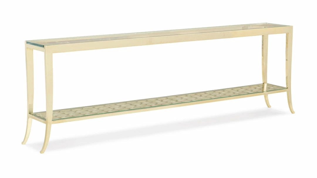 Perfect behind a sofa or in a long hallway, this console table is slim and modern. A stretcher of cut metal features an elongated contemporary honeycomb motif suspended between four graceful sabre metal legs – all bathed in highly polished Whisper of Gold. Paired with an ultra-clear glass top with a waterfall effect at each end, use this piece to brighten any room.