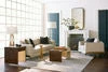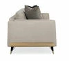 This captivating sofa exudes luxe appeal from its sumptuous seating to the refined tapered legs capped with gold heels and the most delicate bracing detail. Its upholstered base is graciously curved and cupped by a champagne gold metal plate. Perfect for lengthy conversations and entertaining, the three-seat design makes for a traditional appearance, while the nestled side bolsters say it’s all about today’s comfort. Upholstered in a neutral Congo taupe fabric and layered with sable and bittersweet chocolate color pillows, all which create a lesson in curated dimension thru the manipulation of color tones and textures.