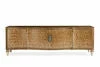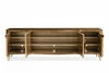 As extraordinary as a perfect shell sparkling in the sand, this distinctive console reflects the interplay of man and the environment. Its four stunning, shaped doors feature an extraordinary matched radiating pattern of Capiz shells that stretches out like rays from the sun. Its Capiz shell exterior is tinted in a warm golden brown and complemented by the rich Dappled mink finish accentuating its timeless silhouette. Distinctive hardware featuring an abalone inlay encased in acrylic and glass and finished in Champagne Reflections adds to its allure. Look behind each door and find an adjustable shelf and wire management for added functionality. A Warm Reflections finish adds luster to its legs, trim and interior.