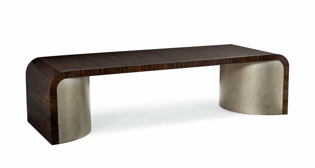 Fumed figured eucalyptus wood, finished to a high sheen in luscious Aged Bourbon, wraps the top of this rectangular table that is void of sharp angles. Two large, half-moon-shaped pedestals support the piece and are covered in Smoked Bronze. The smooth, elegant curves of this cocktail table will not be forgotten.