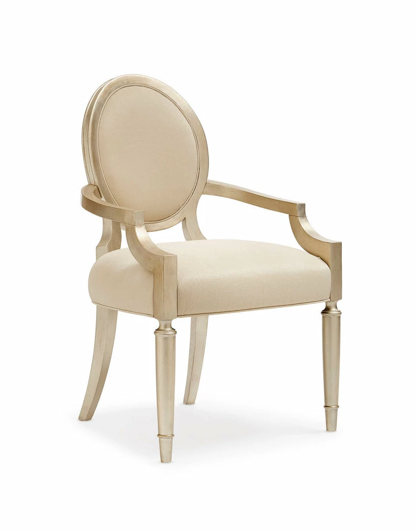 This fauteuil’s sweeping carved woodwork is gilded in Auric silver leaf to create the perfect dining arm chair around a table or standing alone. The classically French carved frame encircles the ivory upholstered front, back and seat and extends down fluted tapered front and sabre back legs. This is a comfortable piece with an elegance all its own.