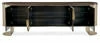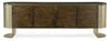 Handpicked for its uncompromising style, this credenza is destined to become a room’s focal point. You can’t help but stare at its unforgettably stylish doors crafted of radial matched Paldao veneers. Its metal frame and curved ends feature an exquisite Golden Blonde Leaf finish while its top wears a rich Galway finish. You’ll find an adjustable shelf and tray drawer hidden behind the center doors. The resulting look is one of refreshing reinvention rich with character.