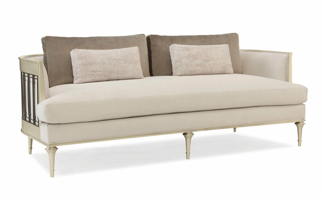 Crisp and clean, this stylish sofa offers a fashion-forward mix of materials that are distinctly Caracole. A stunning, wraparound detail in Tungsten metal was inspired by an iron gate we noted while traveling. A soothing menswear palette with suiting colors in grey and neutral and a sophisticated frame finished in Platinum give this inspiring silhouette a fresh, current look. Clad in a shimmery white boucle with boxed back cushions in a soft grey velvet and chic little bolsters that offer an interesting rough weave and a white, linear pattern that mimics winter mountaintops. This compelling silhouette’s 360 degrees worth of details make it distinctively suited for rooms with floating seating arrangements.