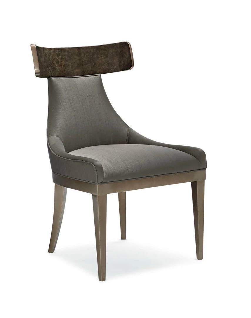 This contemporary wingback chair has pulled up to the table in style. Its dramatic upper rail features softly curved Sepia Burl that has been edged in glistening Harvest Bronze. Fully upholstered in a luxurious smoky grey faux dupioni silk, the svelte back is narrower at the top than at the base of the tight seat. The chair’s exposed wood base, front tapered legs and rear sabre legs have been finished in Harvest Bronze.