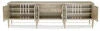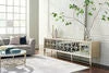 Destined to steal the scene, this luxurious console offers exquisite styling and modern media storage. Its signature look is brought to life with six doors featuring antique mirror fronts highlighted with elegant fret work in Taupe Silver Leaf. Balanced in every way, its symmetrical design is accented by unique Mother of pearl hardware. Inside, you’ll find integrated wire management and ventilation that makes media and electronics storage a breeze. Two soft-close tray drawers add function to its center section while two adjustable shelves can be found behind each pair of outside doors. Fashionable metal feet and stretchers add beauty to its long, lean profile while emphasizing its overall allure.