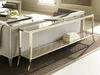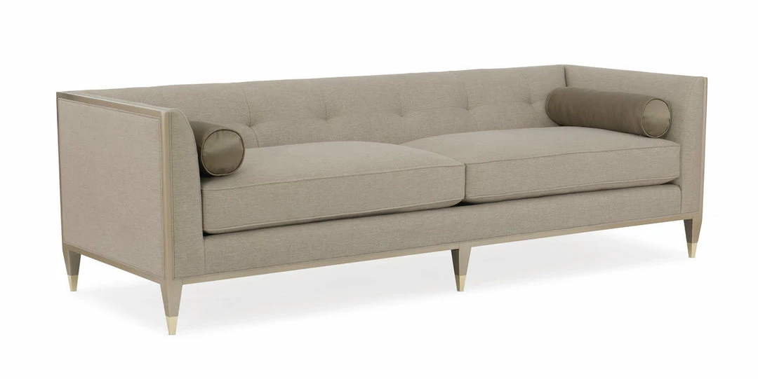 This smart sofa has a streamlined rectangular frame in Taupe Paint that completely surrounds this dapper piece. Its mid-Century modern appeal has been updated with a low European profile, pristine tailoring and modern pyramidal feet with Whisper of Gold ferrules. Completely upholstered in a light fawn tweed, the in-back has blind tufting. There are two seat cushions and two contrasting satin bolsters in dark fawn.