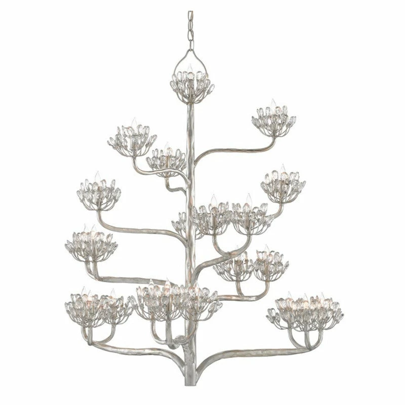 The silver Agave Americana Chandelier is a grand light fixture inspired by the Century plant of the American desert. The 22 lights that effervesce from this fixture are surrounded by clusters of faceted crystals that bloom from branches of hand-forged metal tubes. The metal has been treated to a contemporary silver leaf finish for a lovely glow. In our Marjorie Skouras Collection, we also offer the Agave as wall sconces and a floor candelabra.Â