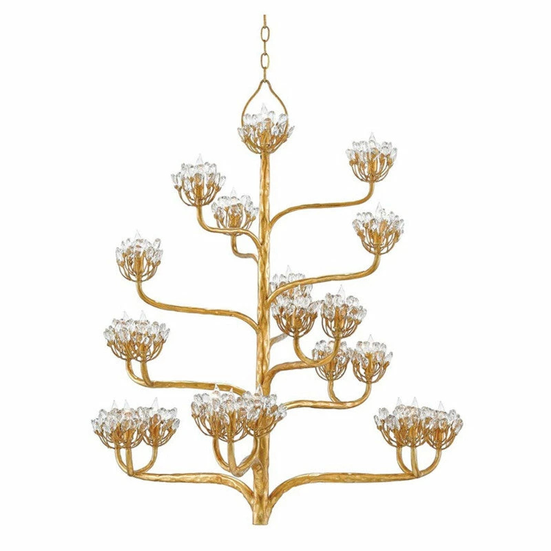 The Agave Americana Chandelier is a grand light fixture inspired by the Century plant of the American desert. The 22 lights that effervesce from this fixture are surrounded by clusters of faceted crystals that bloom from branches of hand-forged metal tubes. The metal has been treated to a dark contemporary gold leaf finish for a lovely glow. In our Marjorie Skouras Collection, we also offer the Agave as wall sconces and a floor candelabra.