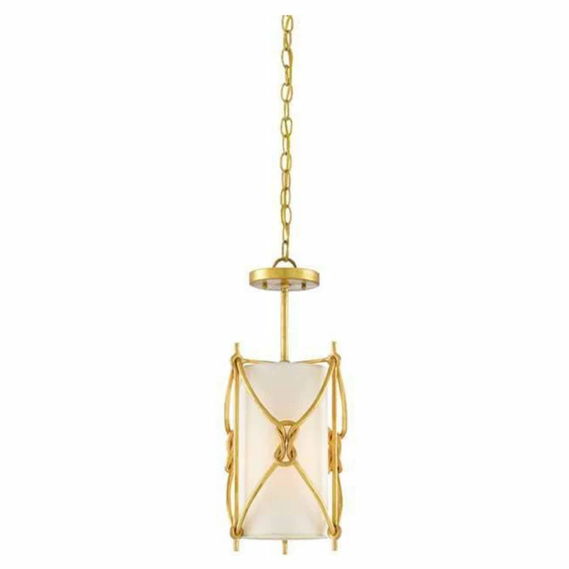 Mythology has some knotty tales, the one Theseus inhabited a circuitous one. Thankfully he was loved by an immortal who helped him escape the labyrinth, a woman just as clever as our namesake Ariadne Pendant in a small size with its looping knots and sexy swagger. The body of the fixture is made of wrought iron that has been treated to a contemporary gold leaf finish. The inset shade that softens the light source is made of off-white shantung. This pendant joins a number of pieces in our Ariadne offerings.