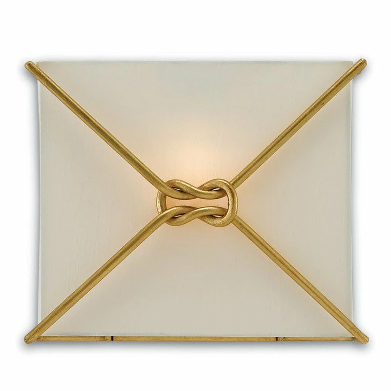 Mythology has some knotty tales, the one Theseus inhabited a circuitous one. Thankfully he was loved by an immortal who helped him escape the labyrinth, a woman just as clever as our namesake Ariadne Wall Sconce with its looping knots and sexy swagger. The body of this square version of the fixture is made of wrought iron that has been treated to a contemporary gold leaf finish. The inset shade that softens the light source is made of off-white shantung. This sconce joins a number of pieces in our Ariadne offerings. This sconce meets ADA requirements.