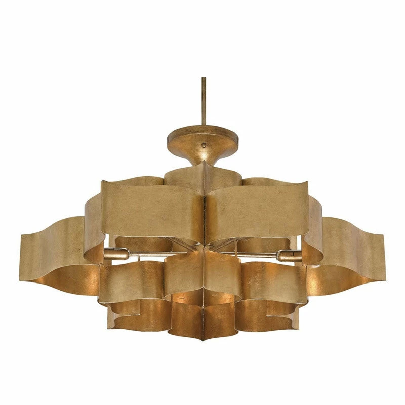 The gold version of the Grand Lotus Chandelier receives its majestic good looks from a combination of stunning workmanship and an antique gold leaf finish. Skillfully fashioned from wrought iron, the fixture is a gorgeous interpretation of the blossom upon which Asian deities are known to pose. The six-light chandelier measures 30 inches in diameter and is adjustable in height. We also offer this fixture, which is one of several fixtures in the Grand Lotus collection, in a contemporary silver leaf finish.