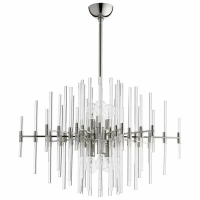 A sleek polished nickel finish looks sensational next to clear glass rods arranged in a staggered linear fashion, allowing light to radiate over a custom designed dining or living ensemble. Embrace a beloved silhouette and add this six-light polished nickel and glass pendant to a fashionable living space.