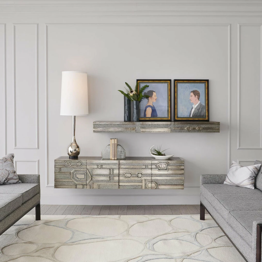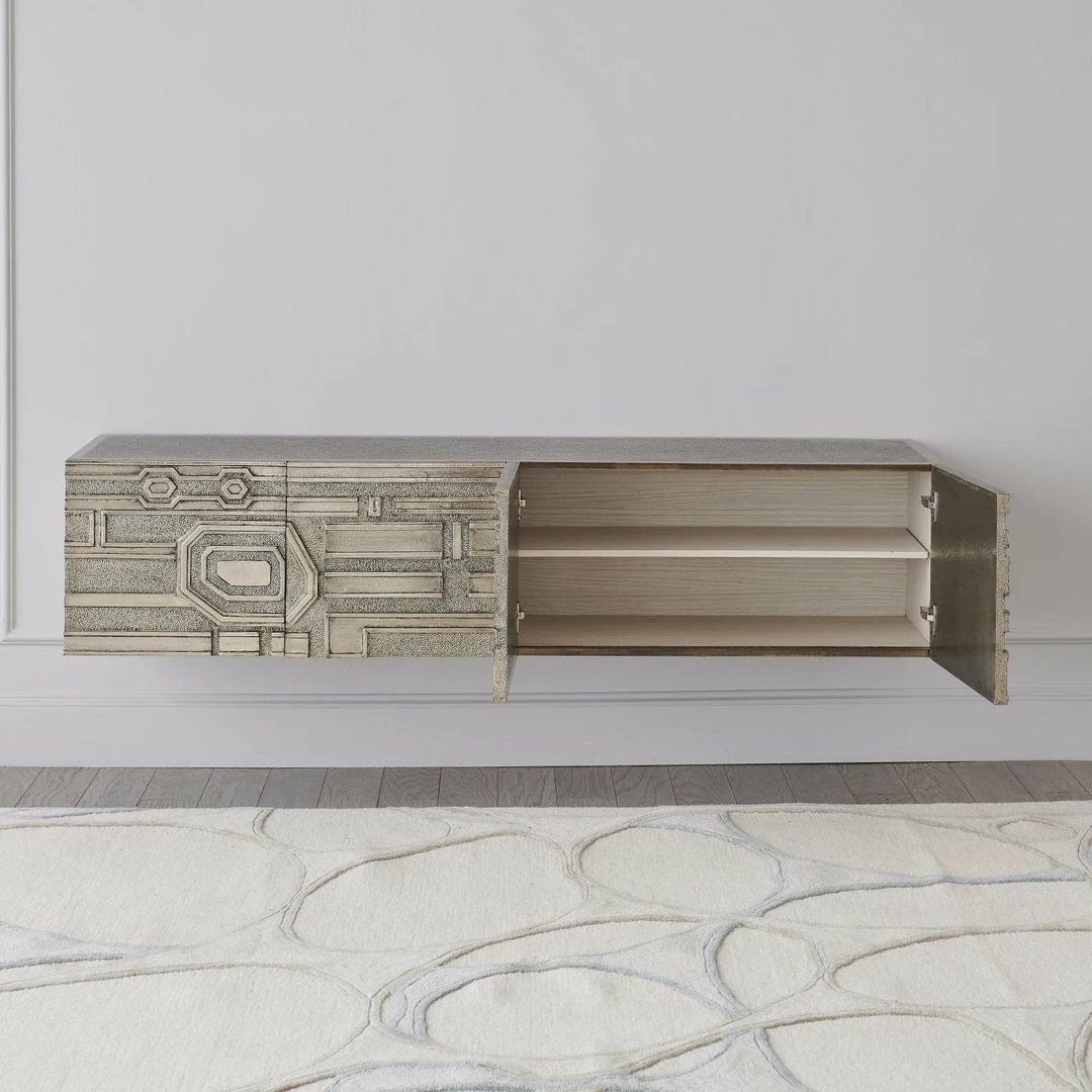 The Abstract Block Cabinet is made of wood and covered in a metal sheet with a protective coating. It features a post modern geometric relief pattern. The floating cabinet contains two compartments for ample storage space.