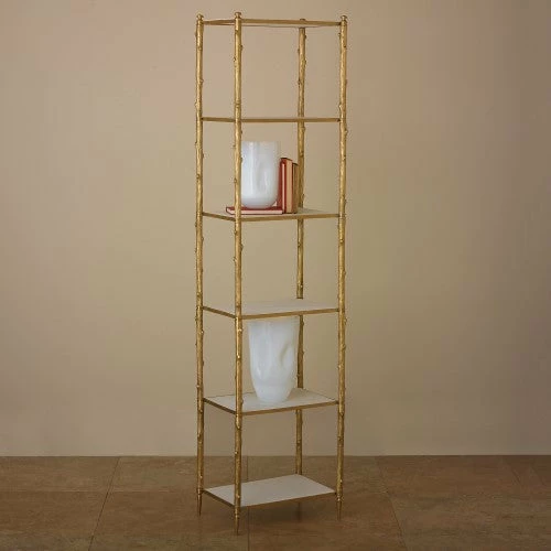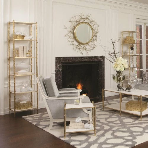 Referencing the natural world, this beautiful etagere has a twig textured brass frame with six stationary, white, honed marble shelves. The simple beauty of the materials shines through in this timeless design.