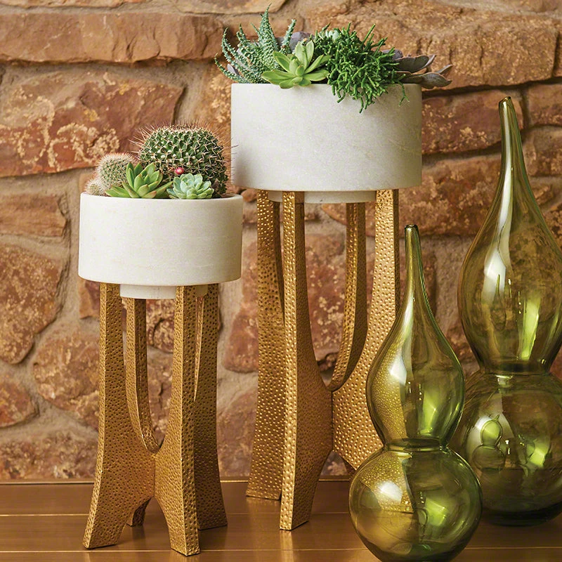 The inspiration for these fantastic mid-century pieces is not hard to guess at all. Named for the Googie-influenced airport, our LAX Bowls are a nod to the mod. The speckled gold finished bases feature soft arcs and hold white marble bowls. Available in three sizes: Oval, Tall, and Short.