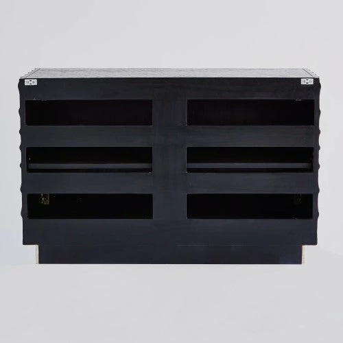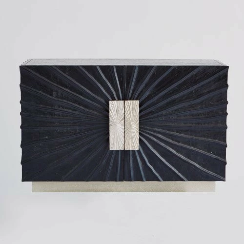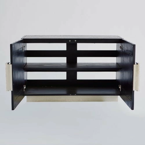 Pleated Media cabinet is vintage inspired. Textured pine wood in a black onyx finish with cast aluminum, door pulls. Equipment cooling slat back and adjustable shelves with a metal clad base.Â