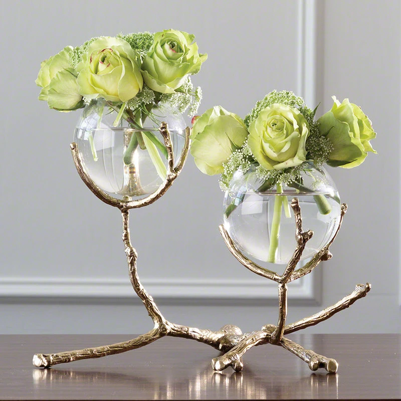 Stems of solid sand-cast brass twist and turn creating our Twig Vase Holders. These delicate vase holders have taken natural elements and turned them into glowing artful accessories. The glass bulb-shaped vases display small buds beautifully. Display one piece for a simple look or show all three sizes together for a dramatic tables cape. Available in three sizes: Large 3-vase holder, Medium 2-vase holder, and Small 1-vase holder. Also available in Nickel.