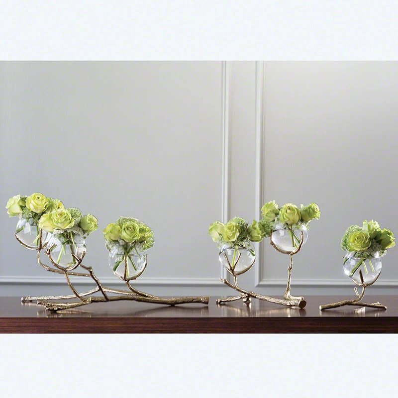 Stems of solid sand-cast brass twist and turn creating our Twig Vase Holders. These delicate vase holders have taken natural elements and turned them into glowing artful accessories. The glass bulb-shaped vases display small buds beautifully. Display one piece for a simple look or show all three sizes together for a dramatic tables cape. Available in three sizes: Large 3-vase holder, Medium 2-vase holder, and Small 1-vase holder. Also available in Nickel.