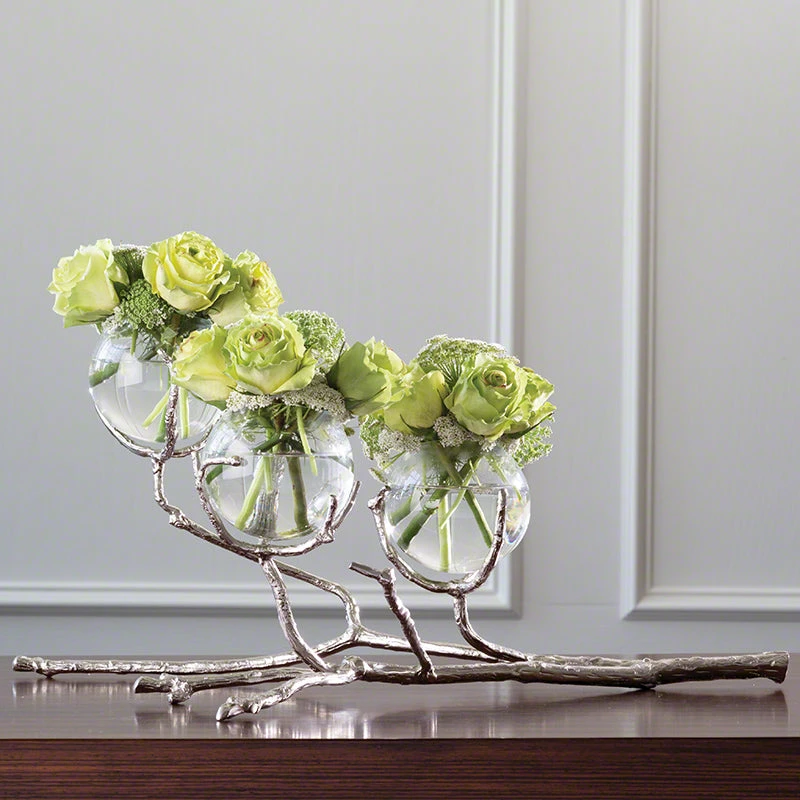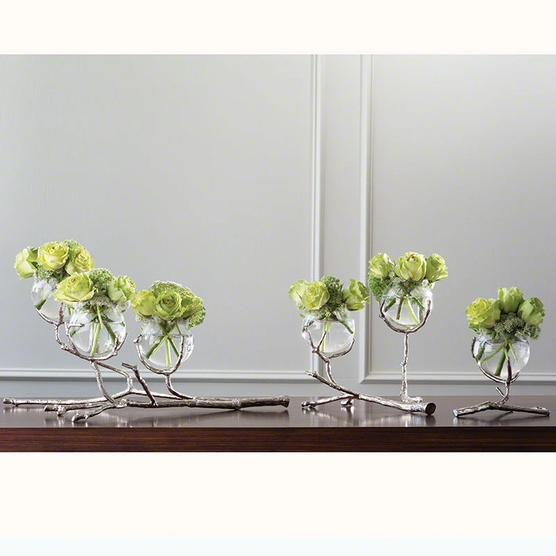 Stems of solid sand-cast brass twist and turn creating our Twig Vase Holders. These delicate vase holders have taken natural elements and turned them into glowing artful accessories. The glass bulb-shaped vases display small buds beautifully. Display one piece for a simple look or show all three sizes together for a dramatic tables cape. Available in three sizes: Large 3-vase holder, Medium 2-vase holder, and Small 1-vase holder. Also available in Brass.