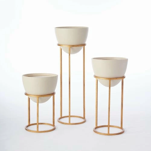 The Wise Egg Planters are cast from a biodegradable, eco-friendly stone composite containing no resin. A removable fiberglass liner keeps the container water tight. Gold-finished iron stands. Available in three stand heights.Â
