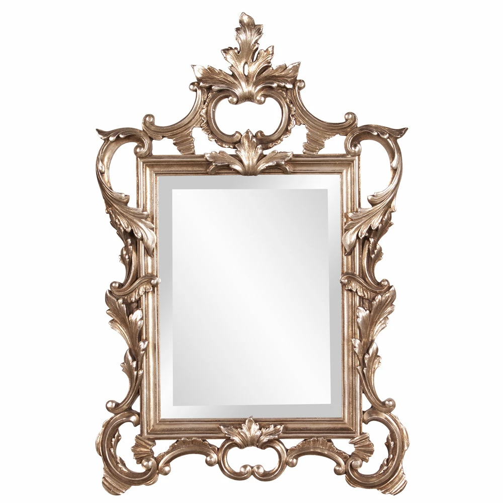 Our Andrews Mirror is a lovely piece with Baroque styling. The rectangular glass mirror is surrounded by a very ornate, open work frame. The frame is then finished in a lovely antique silver leaf. It is a perfect focal point for an entryway, bathroom, bedroom or any room in your home. D-rings are affixed to the back of the mirror so it is ready to hang right out of the box! The mirrored glass on this piece has a bevel adding to its beauty and style.