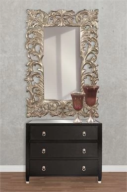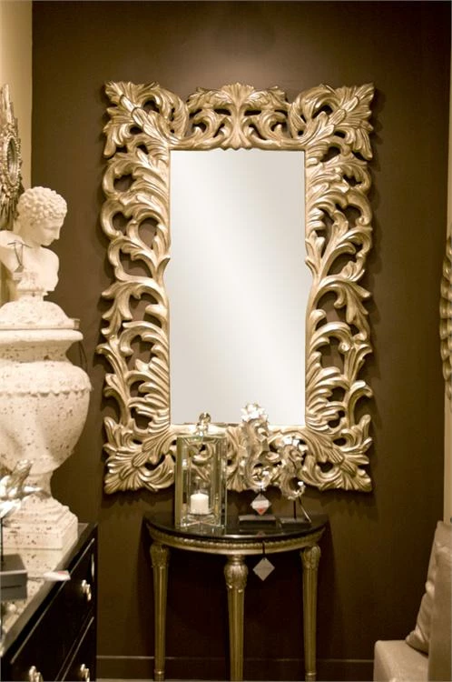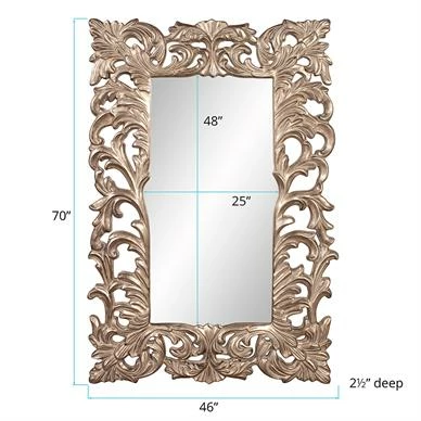 The Augustus Mirror is a lovely piece with a rectangular frame composed of open work scrolls designed in a Baroque style. It is then finished in a warm antique silver leaf. The Agustus Mirror is a perfect accent piece for an entryway, bathroom, bedroom or any room in your home. D-rings are affixed to the back of the mirror so it is ready to hang right out of the box!