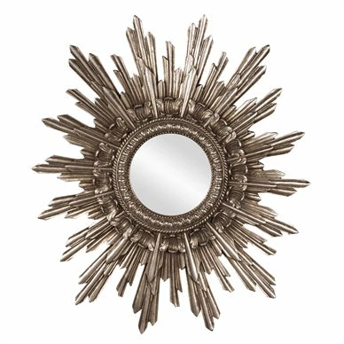 The Chelsea Mirror is a gorgeous piece. It is fashioned with an Art Deco flair. The main frame is oval shaped with bars radiating from the piece to form a starburst pattern. It is then finished in a lovely silver leaf. It is a perfect focal point for an entryway, bathroom, bedroom or any room in your home. D-rings are affixed to the back of the mirror so it is ready to hang right out of the box! The mirror on this piece is NOT beveled.