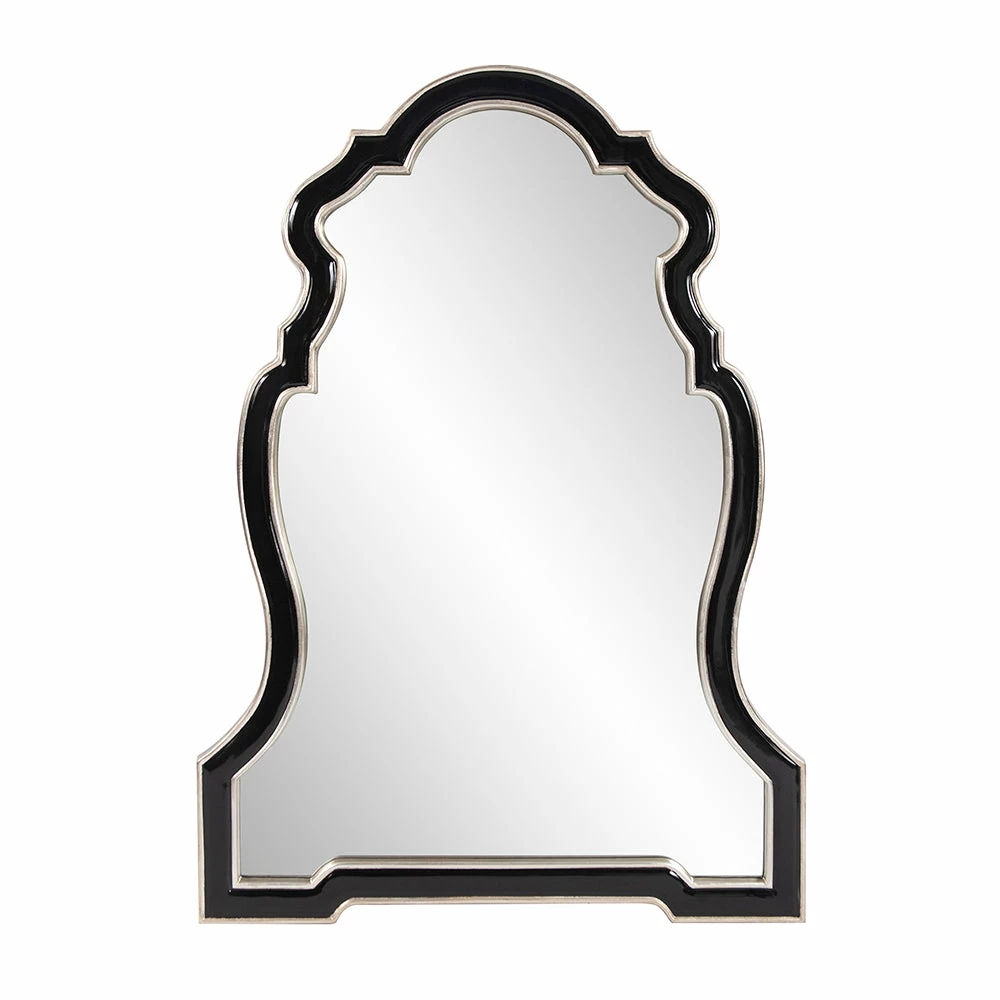The Cleopatra Mirror captures the high design of the Art Deco era. It creates drama with its fancy key hole-esque shape. It is then finished in a lovely glossy black lacquer, then trimmed on the inner and outer edges in a gorgeous champagne silver leaf. It is a perfect focal point for an entryway, bathroom, bedroom or any room in your home. D-rings are affixed to the back of the mirror so it is ready to hang right out of the box! The mirror on this piece is NOT beveled.