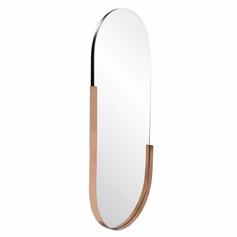 Our Dante Mirror is the definition of minimalistic style. With the idea that “less is more”, this mirror features a long, oval shape and is partially trimmed in a flat, stainless steel frame in a striking polished rose gold. This design provides a contemporary flair that is sure to be that conversation piece. “D” Rings are affixed to the back of the mirror making it ready to hang right out of the box. This mirror can only be hung vertically.