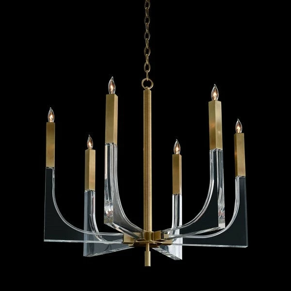 Classic form meets graphic modern design in this acrylic and antique brass, six-light chandelier.