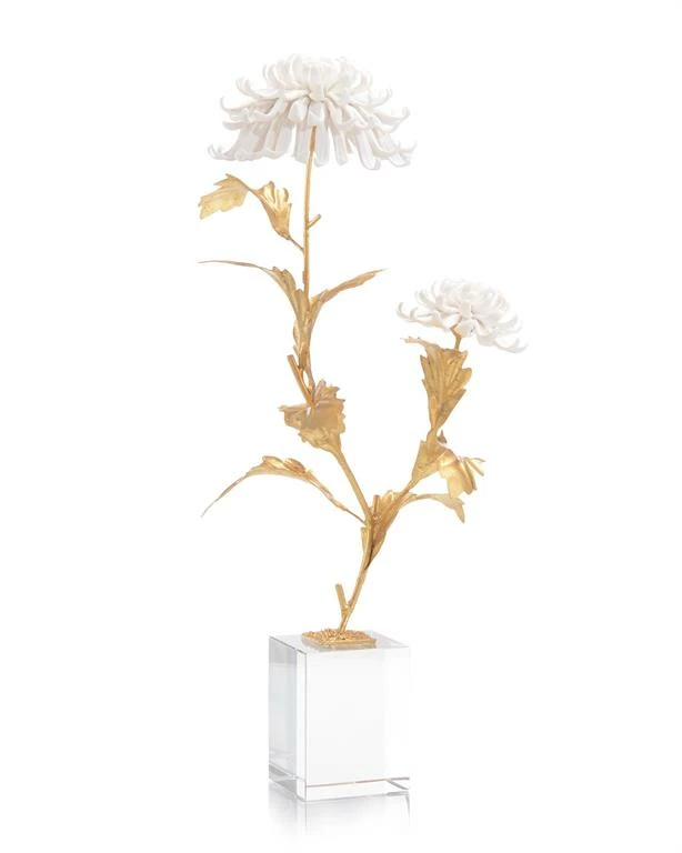 A pair of Avignon’ chrysanthemums stand tall in white porcelain and gold on a crystal base.