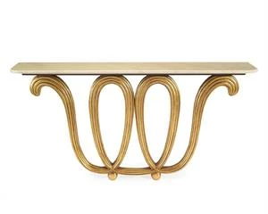 Inspired by the designer Borsani, the base is a carved and reeded series of loops, which support the Crema Marfil marble top. The console table is not freestanding and must be secured to the wall.