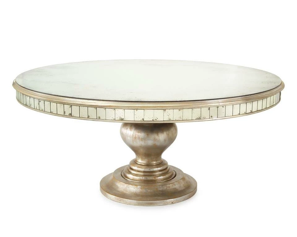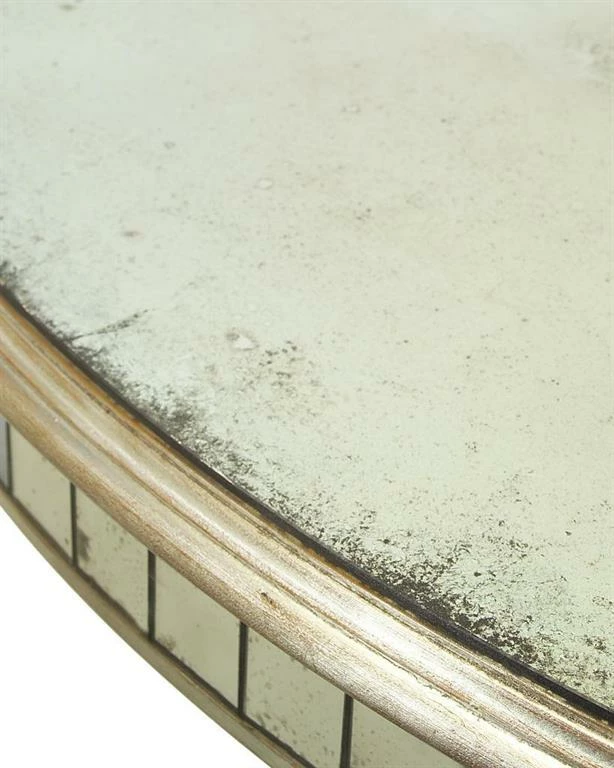 The turned, bulbous column and edge details are finished in Parisian silver, while the apron rail is inset with antiqued mirror tiles, above which there is a foxed mirror top.