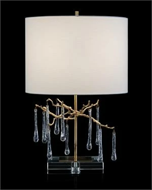 A table lamp featuring organically formed brass branches dripping with handblown glass teardrops on a crystal base. Shade: (18″ X 13″) X (18″ X 13″) X 13″, White outside and inside, Man-Made Linen and Man-Made Silk. 3 Way, 150 Watt Max, Type A